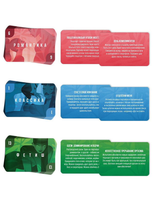 А после решите, поощрения или наказания заслуживает сабмиссив. Вытягивайте карточки из соответствующих колод и воплощайте все фантазии в жизнь!